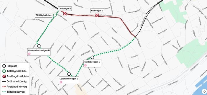 Hållplats Ormberget och Kronvägen på linje 3 mot Flygplatsen flyttas 2025-09-09 kl 4:00 till 2025-10-20 kl 3:59 på grund av vägarbete. Resenärer hänvisas till en tillfällig hållplats.