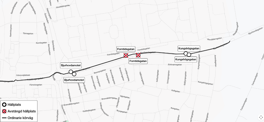 Hållplats Forntidsgatan på linje 1 är avstängd 2025-10-06 kl 4:00 till 2026-01-01 kl 3:59 på grund av vägarbete. Resenärer hänvisas till hållplatserna Bjurhovdamotet och Kungshögsgatan.