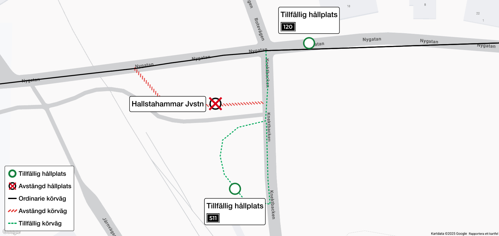 Hållplats Hallstahammar Jvstn på linje 120 och 511 flyttas 2025-10-06 kl 4:00 till 2025-10-18 kl 3:59 på grund av vägarbete. Resenärer på linje 120 hänvisas till tillfällig hållplats på Nygatan och resenärer på linje 511 hänvisas till en tillfällig hållplats på parkeringen intill järnvägsstationen.
