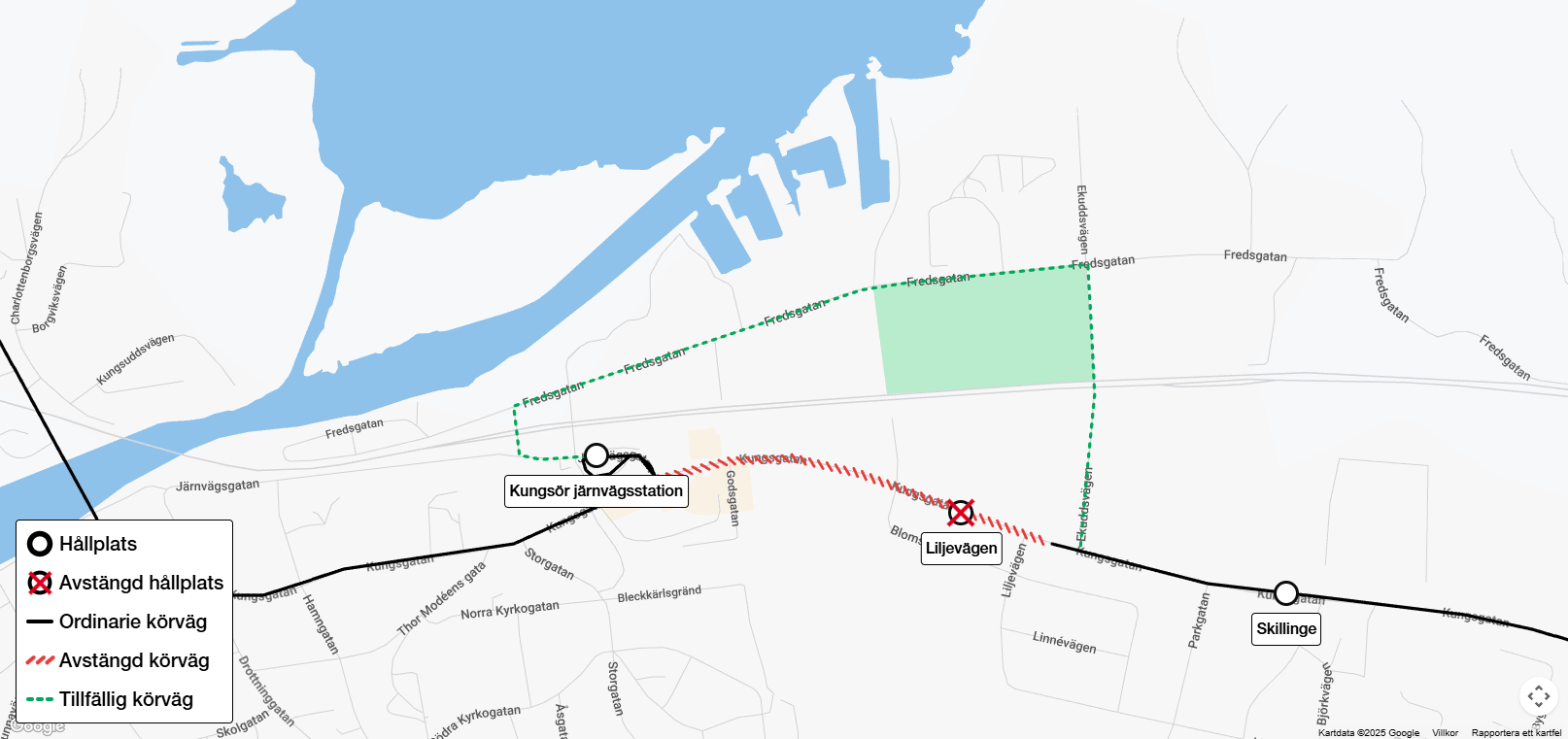 Hållplats Liljevägen på linje 550B är avstängd 2025-10-06 kl 4:00 till 2025-10-21 kl 2:59 på grund av vägarbete. Resenärer hänvisas till hållplatserna Kungsör järnvägsstation och Skillinge.