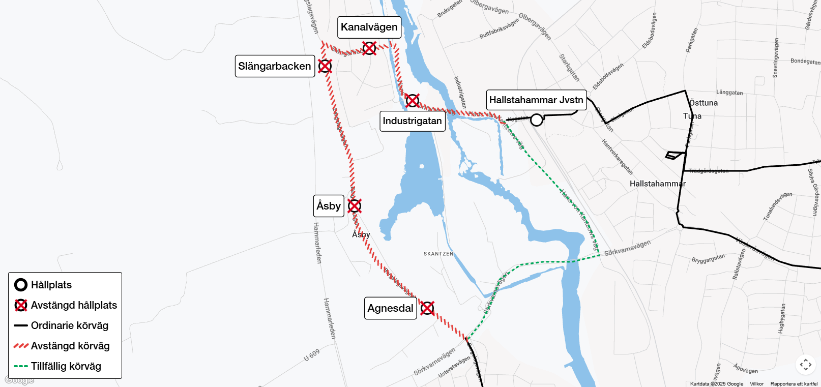 Hållplats Industrigatan, Kanalvägen, Slängarbacken, Åsby och Agnesdal på linje 120 är avstängd 2025-10-06 kl 6:00 till 2025-10-24 kl 16:00 på grund av vägarbete. Resenärer hänvisas till hållplatserna Näs, Ågatan och Hallstahammar Jvstn. Observera att hållplatsen Hallstahammar Jvstn tillfälligt är flyttad under perioden 6 oktober till och med 17 oktober.