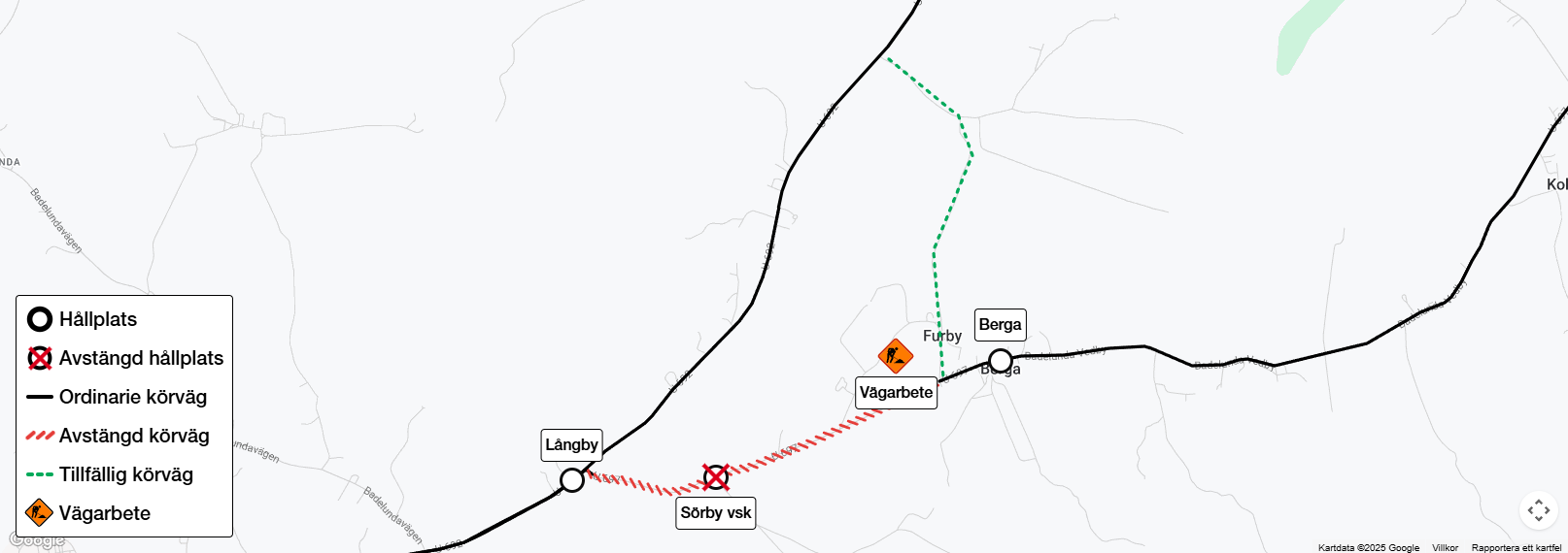Hållplats Sörby vsk på linje 24 är avstängd 2025-10-06 kl 4:00 till 2025-11-17 kl 3:59 på grund av vägarbete. Resenärer hänvisas till hållplatserna Berga och Långby.