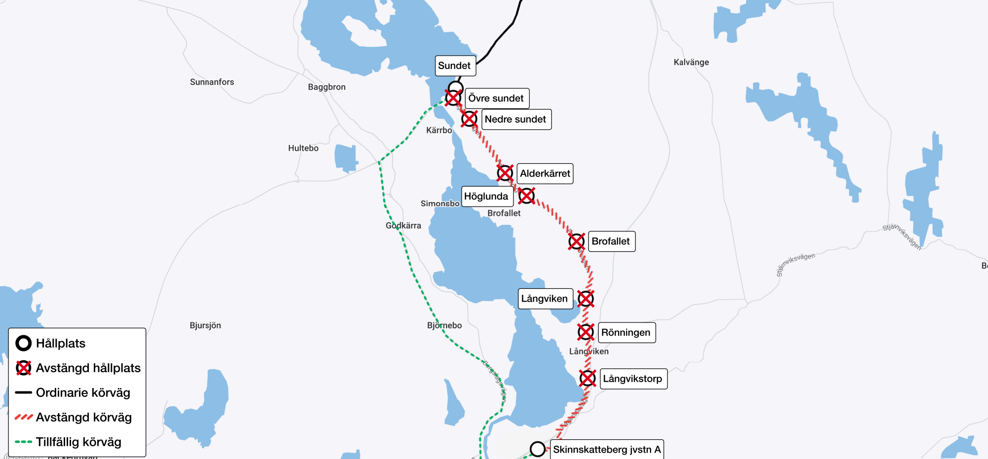 Hållplats Långvikstorp, Rönningen, Långviken, Brofallet, Höglunda, Alderkärret, Nedre sundet och Övre sundet på linje 500 är avstängd 2025-10-13 kl 9:00 till 2025-10-13 kl 14:00 på grund av vägarbete. Resenärer hänvisas till hållplats Skinnskatteberg Jvstn och Sundet.