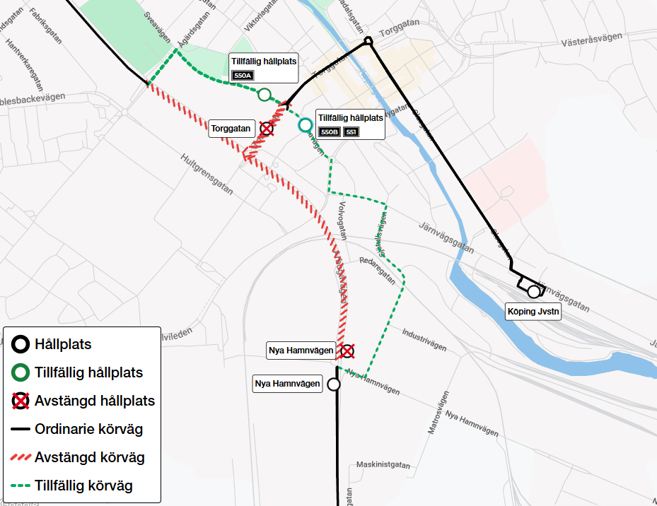 Hållplats Nya Hamnvägen på linje 551 mot Köping och 550B mot Köping är avstängd 2025-11-03 kl 4:00 till 2025-11-08 kl 3:59 på grund av vägarbete. Resenärer hänvisas till tillfällig hållplats för Torggatan. Se separat trafikinformation för Torggatan.