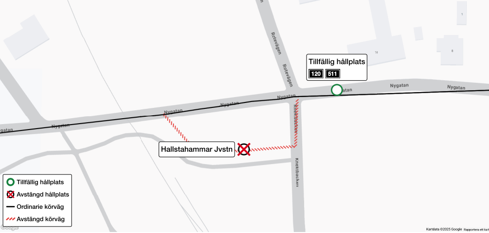 Hållplats Hallstahammar Jvstn på linje 120 och 511 flyttas 2025-11-05 kl 4:00 till 2025-11-06 kl 3:59 på grund av vägarbete. Resenärer hänvisas till en tillfällig hållplats i närheten.