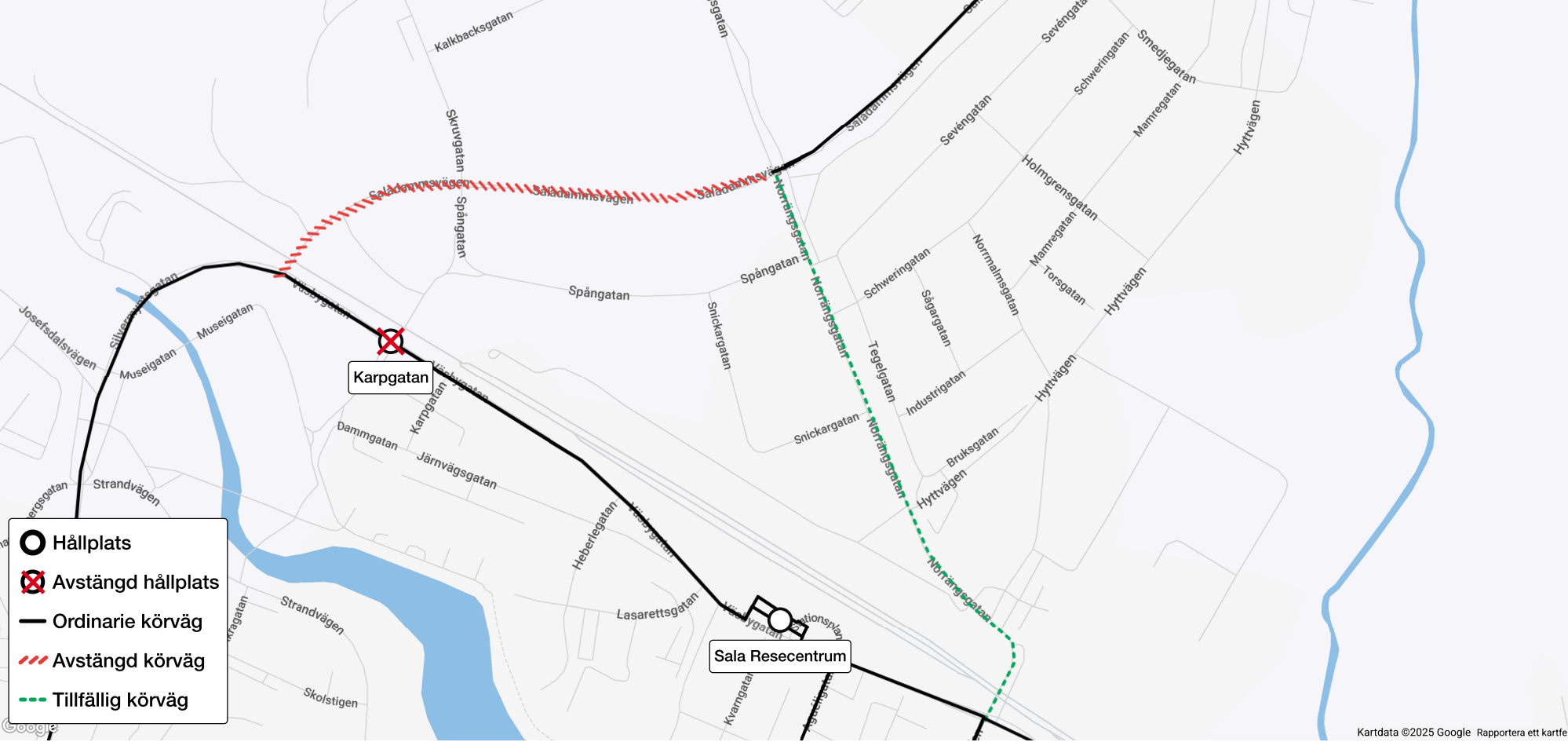 Hållplats Karpgatan på linje 60 och 64 är avstängd 2025-11-06 kl 4:00 till 2025-11-13 kl 3:59 på grund av vägarbete. Resenärer hänvisas till hållplats Sala Resecentrum.