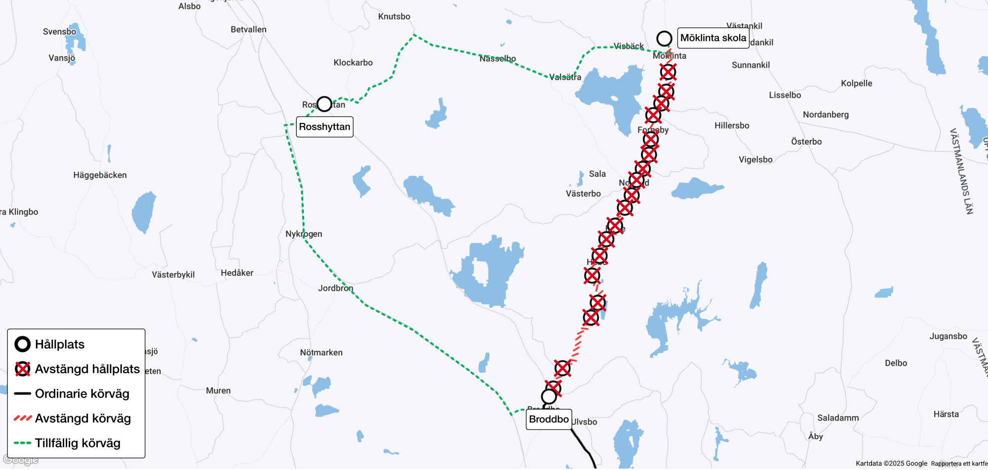 Hållplats Broddbo affären, Skatslätten, Klövsjö Gård, Klövsjön, Sjövallsmossen, Hebo, Västerbo vsk, Hede, Hede bastu, Västervads vsk, Norrvad, Östervad, Hasselbacken, Forneby såg, Forneby gata, Hillersbo vsk, Kapellet och Möklinta södra på linje 63 är avstängd 2025-12-02 kl 19:00 till 2025-12-05 kl 6:00 på grund av vägarbete. Resenärer hänvisas till hållplats Broddbo och Möklinta skola. Observera att avstängningen endast gäller mellan kl 19.00-06.00, övriga tider trafikeras alla hållplatser.