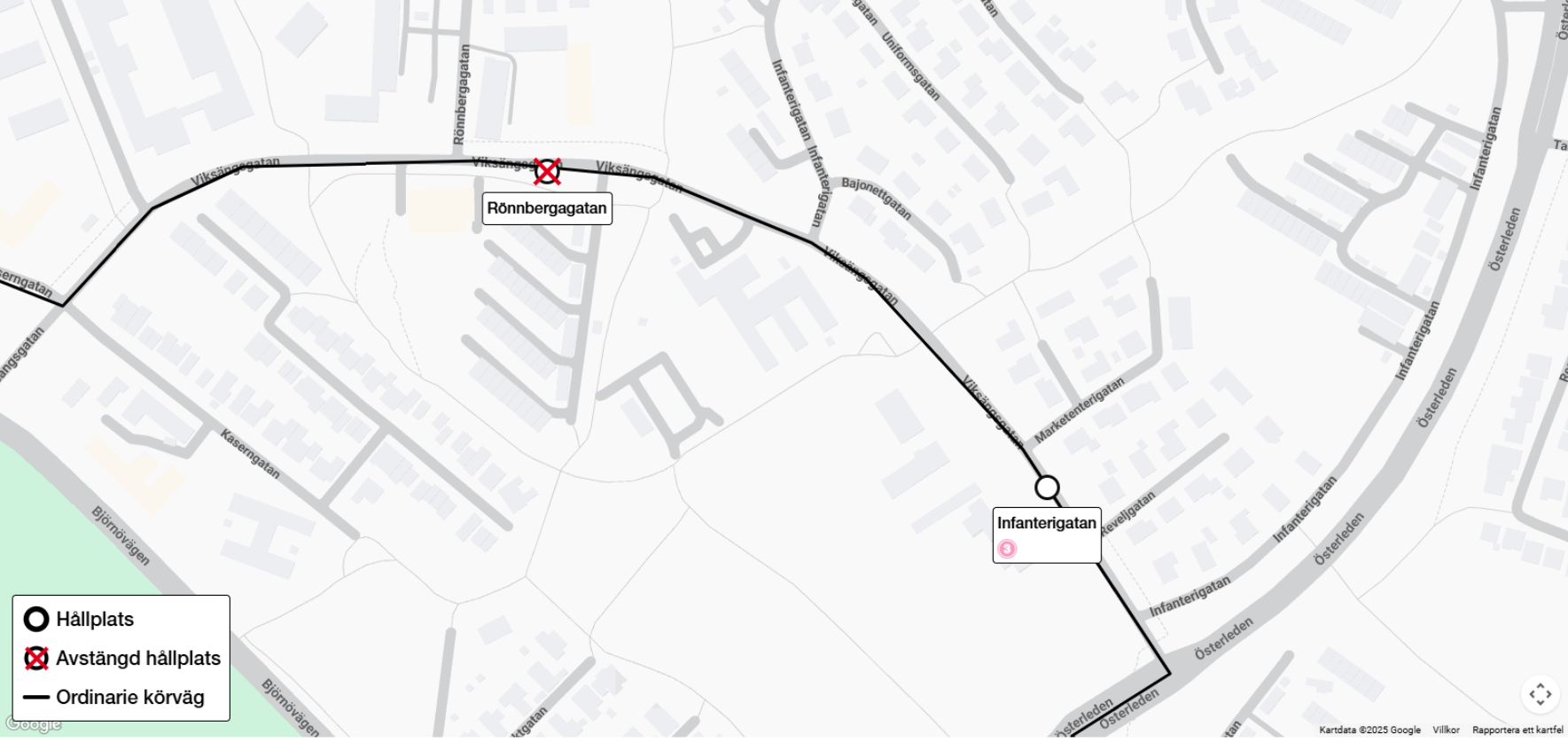 Hållplats Rönnbergagatan på linje 3 mot Flygplatsen är avstängd 2025-11-06 kl 10:55 till 2025-12-02 kl 3:59 på grund av vägarbete. Resenärer hänvisas till hållplats Infanterigatan.
