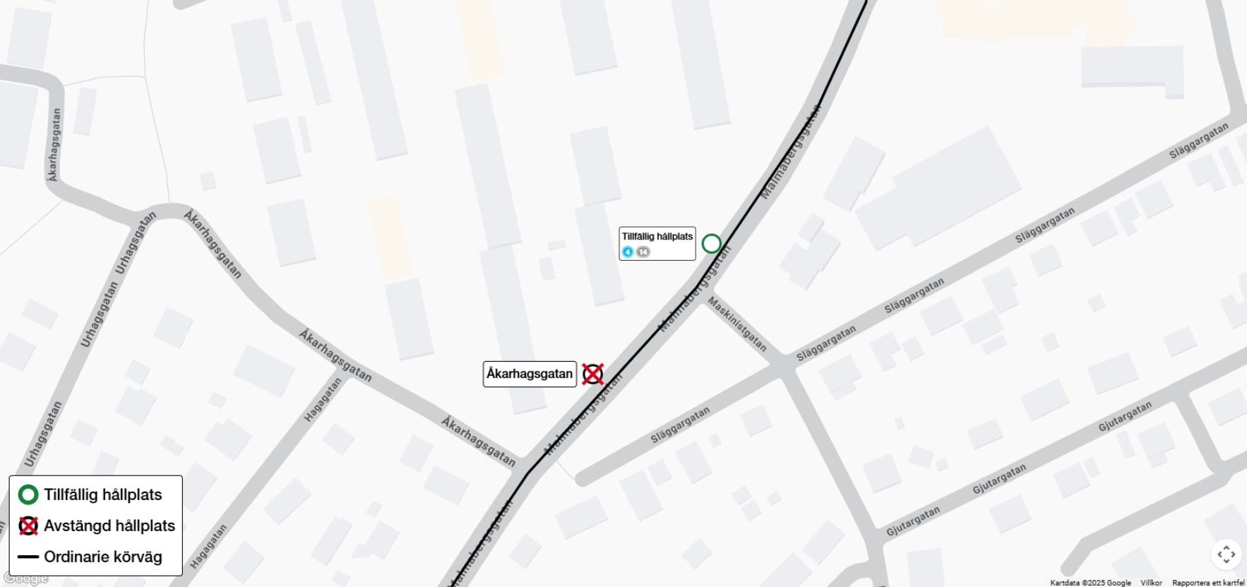 Hållplats Åkarhagsgatan på linje 4 mot Brottberga och 14 mot Eriksborg flyttas 2025-11-10 kl 4:00 till 2025-11-18 kl 3:59 på grund av vägarbete. Resenärer hänvisas till en tillfällig hållplats i närheten.